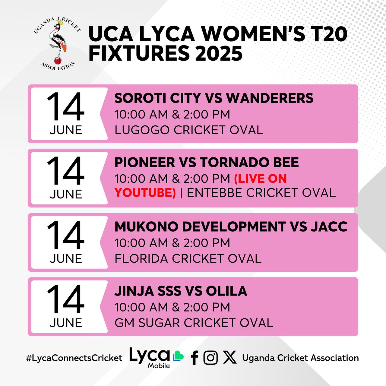 Posted inWomen's T20 Matchday 2 Review – Relentless Olila, Spirited Jinja SS & Tornado Bee Light Up Lyca Women’s T20 League by ucaJune 8, 2025